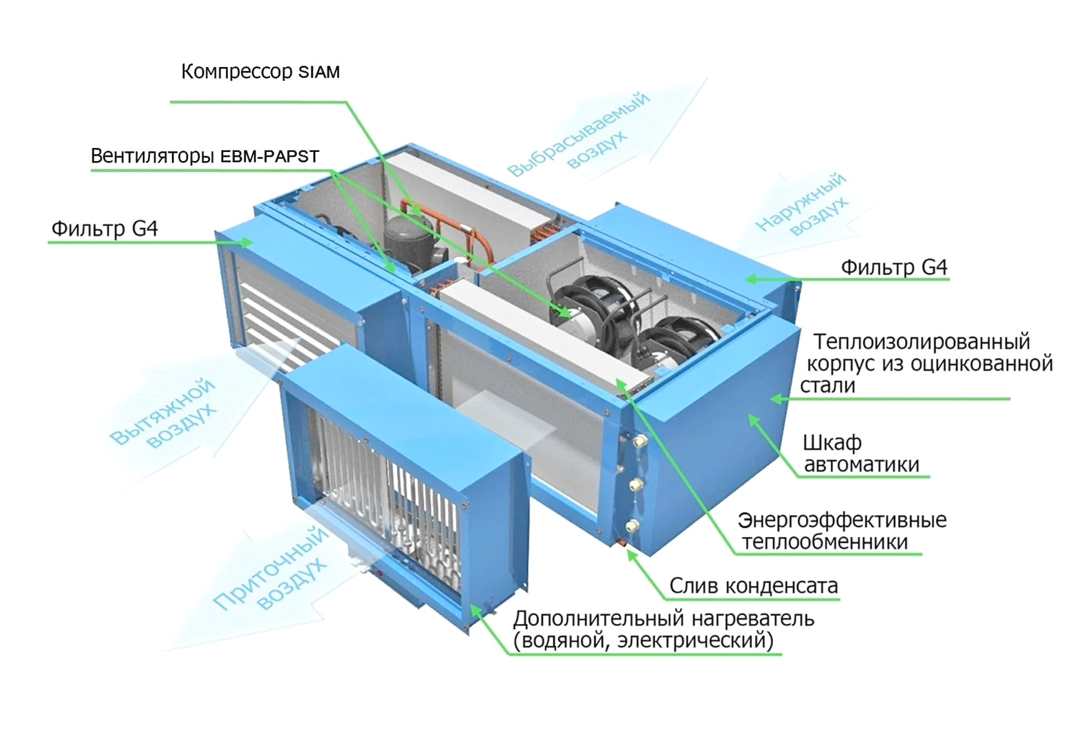 Это более современный и технологичный подход. Система одновременно подаёт свежий воздух и удаляет отработанный. При этом встроенный рекуператор передаёт тепло вытяжного воздуха приточному, снижая теплопотери.